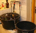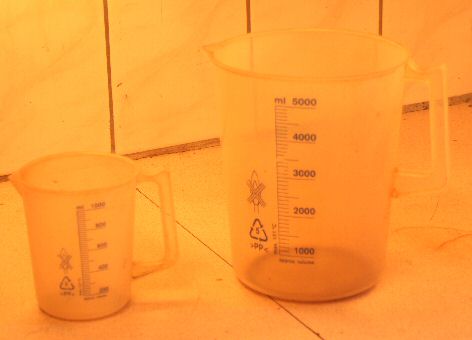 De 2 er med målestreger. De bruges når urten skal hældes på spand. Derved kan man hurtigt aflæse væskemængden og fylde op til 24½ liter med koldt vand. (den sidste ½ liter kommer fra forgæren). Endvidere bruges de 2 måleinddelte spande ved flaskningen, så man kender litermængden af færdigt øl.