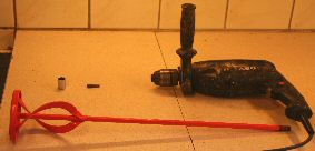Til at trække maltmøllen har jeg en 2-gears boremaskine med forsats og 13 mm top. Maskinen kører i 1. gear. Det samme er tilfældet når der tappes øl på flasker, hvor jeg anvender den store mørtelomrører.